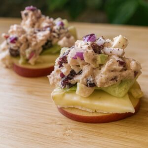 A sweet, savory, and protein-packed twist on classic tuna salad! These vibrant bites are served over crisp apple slices with creamy Brie and fresh lettuce for the ultimate combo of