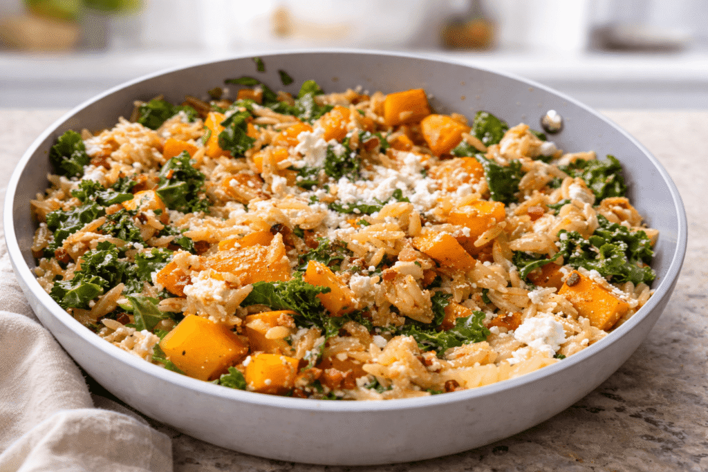If you’re making it ahead, roast the squash and cook the orzo the day before and store them separately. Make the vinaigrette ahead too. Then assemble right before serving so the orzo doesn’t soak up all the dressing overnight. Day of, it takes maybe ten minutes to pull together.