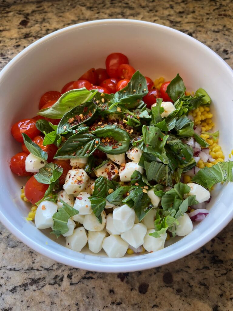 To the couscous, add the roasted tomatoes, fresh cherry tomatoes, chopped shallot, mozzarella balls, and chopped fresh basil.