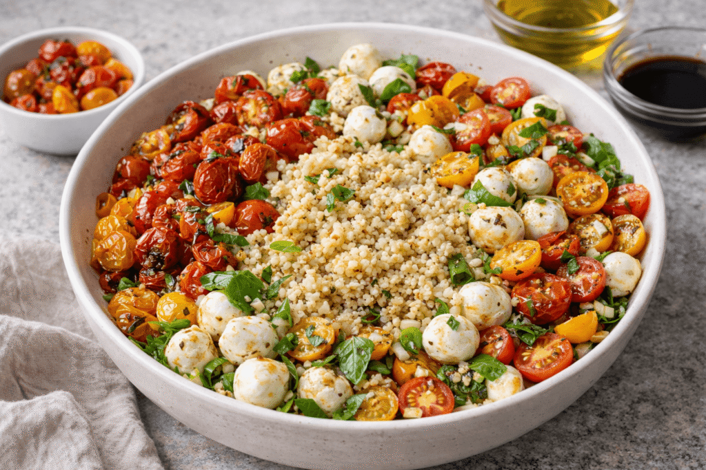 The idea is classic caprese. Tomatoes, mozzarella, basil, balsamic. But instead of just plating those things on a board, you build them into a couscous salad that actually has substance. Fluffy couscous soaks up the balsamic dressing and catches all the flavors around it. Half the tomatoes are roasted until they burst and get jammy, which adds a sweetness you do not get from all-fresh tomatoes. The other half stay raw for brightness and texture.