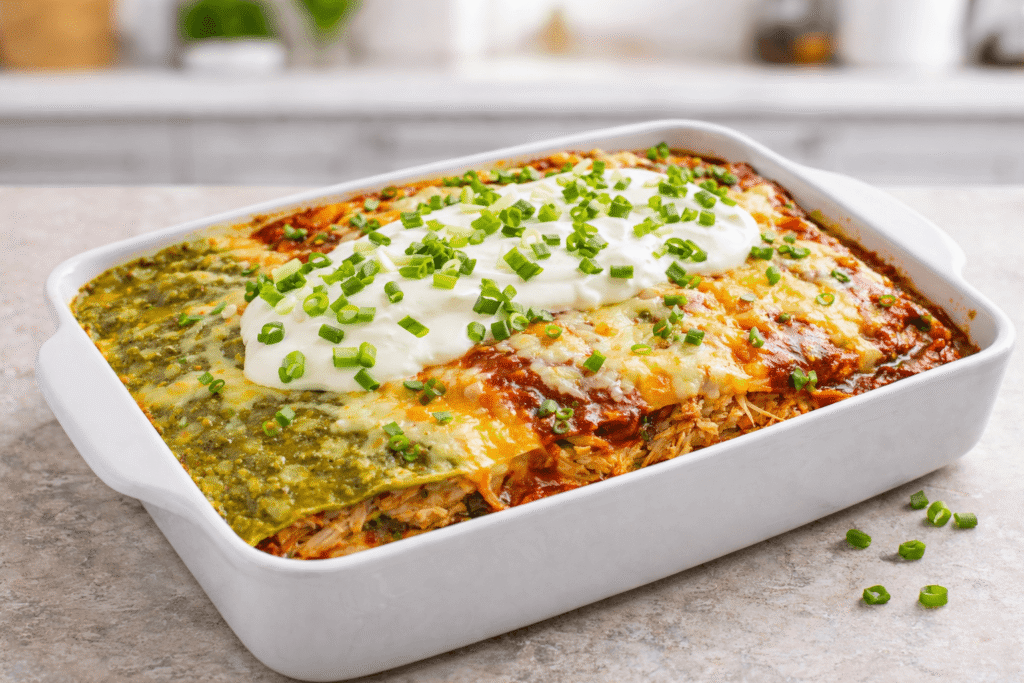 The double sauce situation is not an accident. Red enchilada sauce brings depth and a smoky quality. Green enchilada sauce is brighter and tangier. Using both gives the casserole a complexity that you would not get from either one on its own. It is the reason this dish tastes like something you ordered from a restaurant instead of something you threw together on a Tuesday.