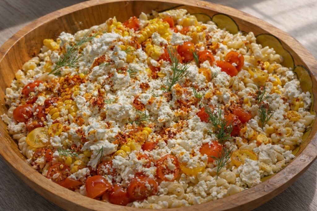 If you want to stretch this into a full meal rather than a side dish, it works really well with a simple grilled protein on the side. Chicken, shrimp, or salmon all pair with these flavors easily. You can also serve it as a main on its own for lunch. With the corn, feta, and pasta it is more filling than a salad made from greens, and it holds you over for hours.